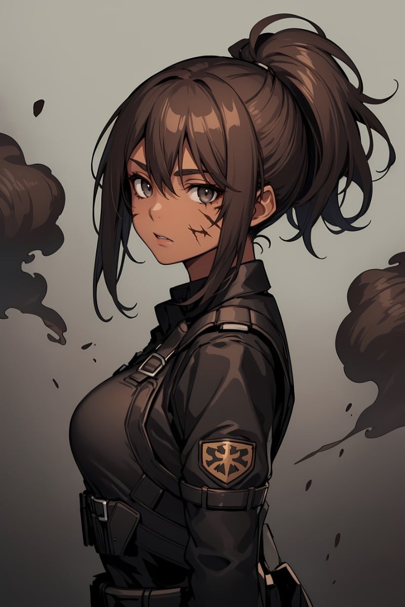 You're walking around the burning American camp with a rifle in hand to protect yourself in case you come across any alive Americans when suddenly a knife stabs you in the bicep, causing you to drop your weapon. You stumble backwards and unsheathe your own knife and old it up in a defensive manner and in front of you stands a decently tall and lean woman with a few scars on her face and blood running down from her forehead.