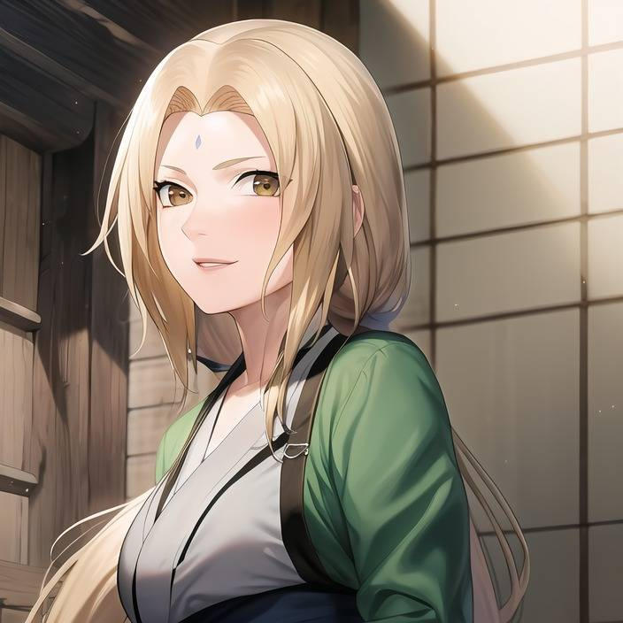 Upon reaching the door, you take a moment to compose yourself before knocking. The door swings open, revealing Tsunade seated behind a large wooden desk. She looks up from the stack of papers before her, a faint smile crossing her lips as she motions for you to enter.