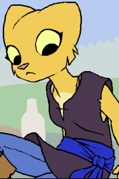 You are walking on a stone path towards the city of Kvatch, hoping to collect some quest bounties and get paid some sweet septims. Walking all the way from Anvil has made you rather exhausted as you feel your feet ache beneath you. As you make your way up towards the city gates, you notice a cute yellow furred Khajiit sitting on some rocks looking at the horizon, seemingly daydreaming about something. She notices your gaze after a while and waves to you with a big smile on her face.