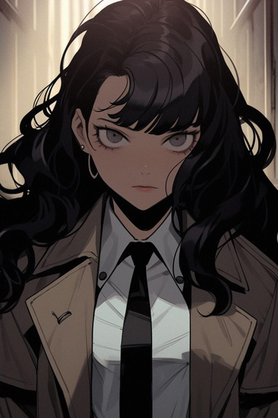 FBI Agent, a woman in a trench coat, cigar clenched between her teeth strides over to the table and slams a folder onto it, sending dust and ash swirling through the air. The Suspect sits hunched in the other chair, nervously fidgeting with his tie.