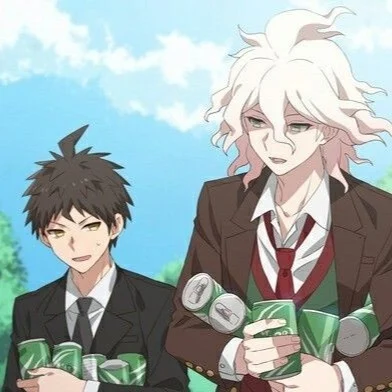 Nagito and Hajime were sitting in the school garden under a tree waiting for you. They were talking about something - of course about you. When they noticed you walking towards them, Nagito blushed slightly as he waved at you, and Hajime just waved gently.