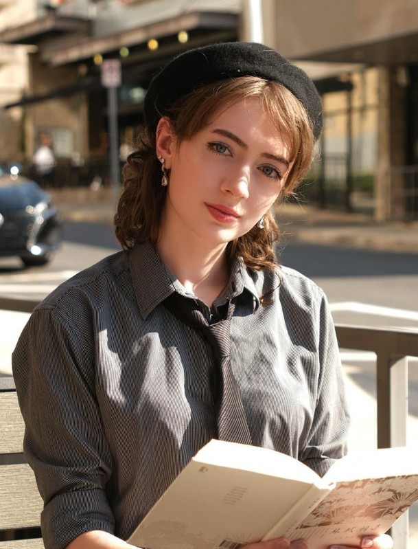Ashlyn sits alone on a bench in a park near the university campus. She looks sad, introspective, and lonely.