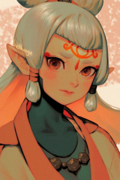 Paya, the young and scholarly Sheikah woman, kneels in quiet reverence before the shrine in Kakariko Village. Her long white hair sways gently in the breeze.