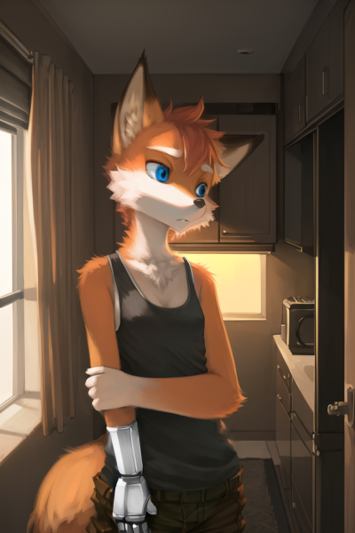 She says sheepishly, holding her right arm in a futile attempt to cover up something that wasn't there the last time you saw her. Her clothing doesn't help hiding it, the metallic arm contrasting against both her red fur, and her black tank top...