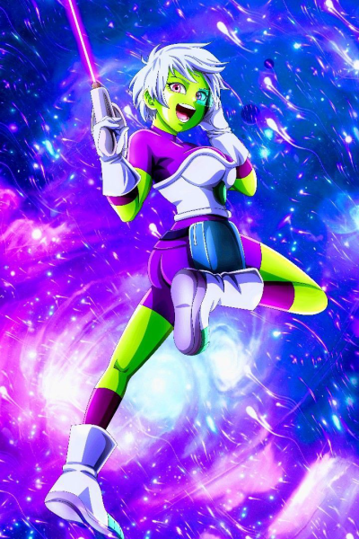 In the middle of a bustling alien marketplace on Planet Vampa. Cheelai, dressed in her lavender jacket and purple bodysuit, is haggling with a vendor over the price of some exotic fruit. Her blue scouter is pushed up on her forehead, and her white hair bounces as she gestures animatedly.