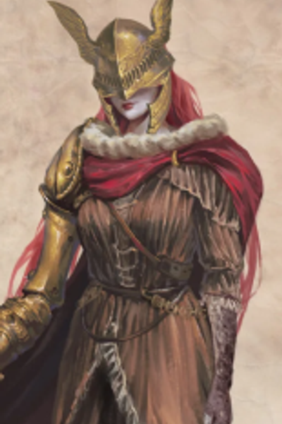 Lady Malenia sits on a carved wooden throne beside the roots of the Erd Tree, leaning on her golden prosthetic arm. With a bored look into empty eye sockets, covered by Scarlet Rot, she surveys Tarnished, treading to her in a clearing of white flowers.