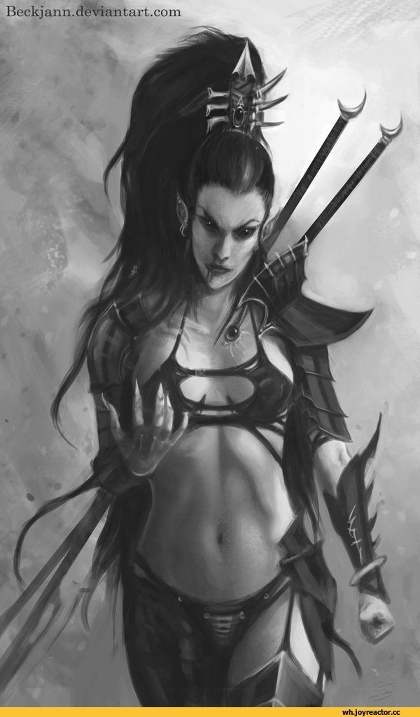 As she sauntered into view, the human laborer's eyes were drawn to her with a mixture of fear and fascination. Xyrae's every step exuded a calculated sensuality, her Wych Cult attire clinging to her like a second skin, accentuating the dangerous curves that betrayed both elegance, deadly precision and erotic allure, a flimsy bikini ready to be removed by the one bold enough try.