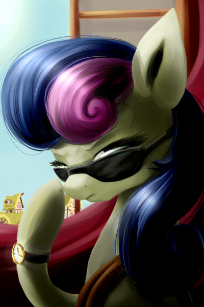 The strange creature lounges in Ponyville's bustling town square, smiling and waving at the passerby ponies unaware of the unseen observer noting its every move. I, Bon Bon, spy extraordinaire and champion of Equestria, study it from behind the flower cart, prepared to thwart whatever sinister agenda it harbors.