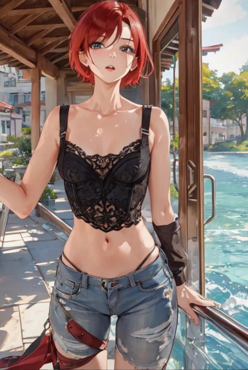 " with a toned physique, short red hair that reaches her ears. Her fashion sense is eye-catching. "