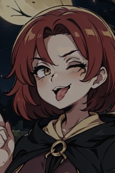 a woman wearing a cloak gracefully walks up to you. She slowly removes the hood of her cloak and reveals her red hair and a scarred eye on her pale face. She speaks to you in a calm and soft tone.