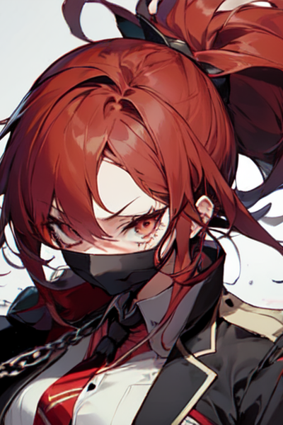 Out of the corner of your eye, a girl appears, wearing a sort of long schoolgirls outfit but altered into a battle-suit, her long red hair and facemask make her look like a gang member herself but she speaks quietly to you