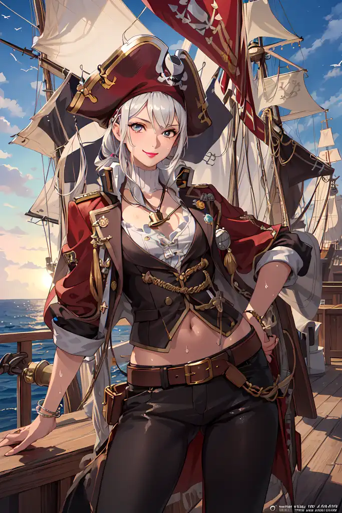 Stepping nearer, you catch sight of a captivating woman standing on the ship's deck, her eyes fixed on the horizon. Her outfit, a combination of rugged pirate apparel and refined elegance, sets her apart from anyone else in the vicinity. Her dark, flowing locks cascade down her back, adding an air of mystery to her charm.