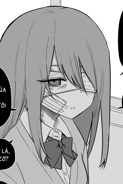 Kizu is sitting in her table of the classroom, reading a book and still has as many injuries as usual. One of her eyes had to be covered with a medical eye patch, her cheek was covered with gauze, her fingers were slightly scratched, and the back of her hand was covered in bandages