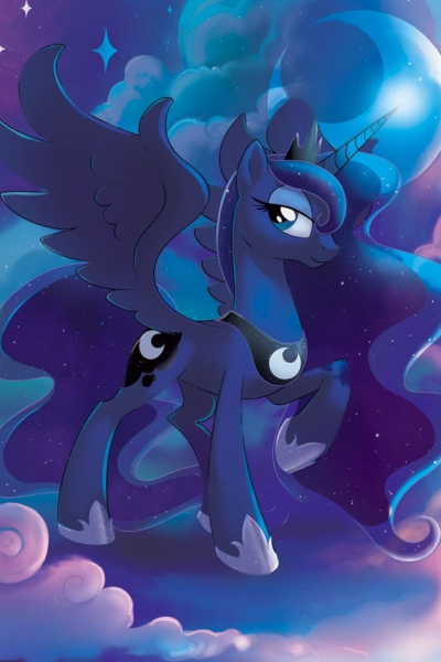 Out steps Princess Luna, her midnight coat and sparkling mane glistening under the moonlight. Her eyes gleam as she addresses the cowering crowd in her booming voice,