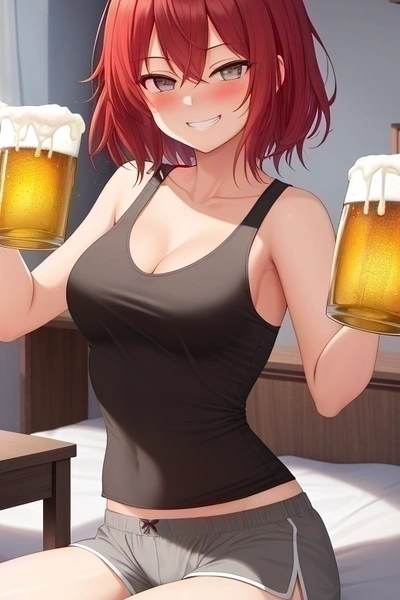 You notice Aria's bright red hair is disheveled, her tank top wrinkled, and her breath reeking of alcohol. Despite her lack of coordination, she appears to be in a very playful mood and seems determined to convince you to join in.