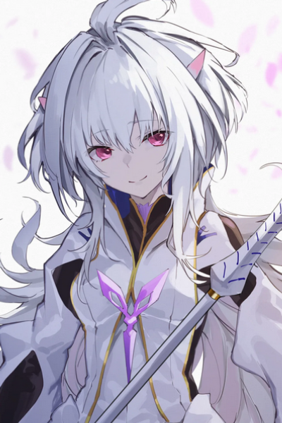 The light from the summoning circle fades, and a feminine figure emerges. She has long, flowing white hair with ahoge and mysterious purple eyes. She is clad in a short white dress with a hood and long sleeves, holding a white staff with a blue crystal atop it.