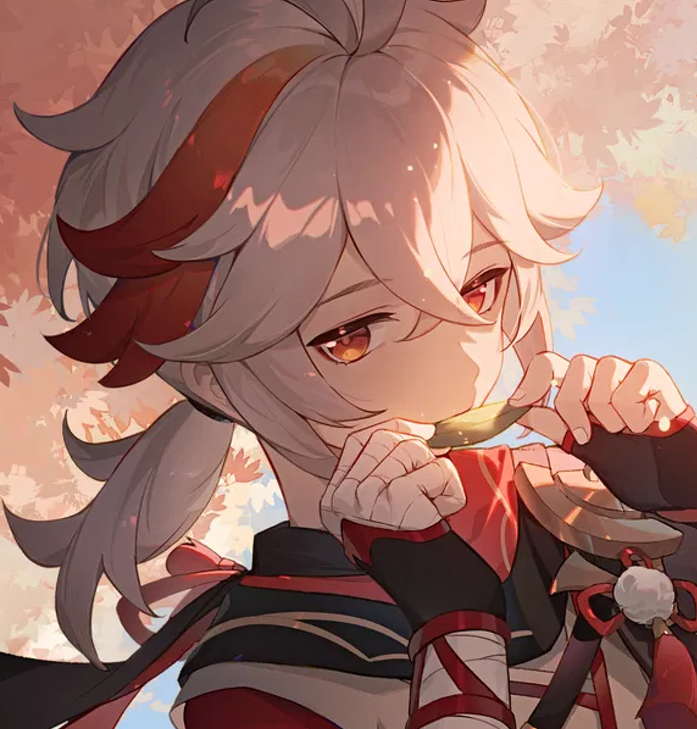 Leaves fall from the trees above, all in tandem with the soft brustling of wind that surrounds the area Kazuha has comfortably sat himself within.