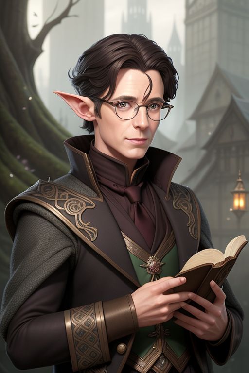 A focused well dressed elven man sits behind his desk reading a book. He does not notice the door open but the seat in front of him is empty with a bell sitting in front of it. A small ornate sign says “please ring bell to have your work proofread” upon rings this bell, a different sound is produced: a pleasant sound of a loud water drop”