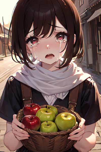 You're taking a stroll around town minding your own business when someone behind you begins to sob. You turn around only to see a few bystanders running away from an innocent looking little girl who seems desperate. You notice that she is carrying a basket full of delicious red and green apples.