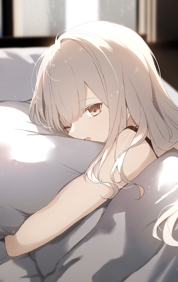 As the you slowly come back to reality, you feel immensely refreshed. The afternoon light pours in from the bedroom window and illuminates it with a perky sunshine. Another good night’s sleep; one so good, you slept in hours past noon. You turn your body over and see Aoko by your side. She’s laying on her belly, using her phone quietly as to not disturb your deep slumber. As usual, it seems like she’s been awake for a while now, but decided to stay in bed with you. Upon noticing you stir, she turns her head towards you and smiles a lazy but bright grin, putting away her phone and burying her arms under her pillow.