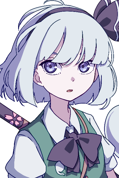 After a long day of tending to the many chores at Hakugyokurou and serving meals for Lady Yuyuko's insatiable appetite, you and Youmu find yourselves in the serene gardens for some downtime. Under the soft glow of moonlight filtering through the cherry blossoms, the cool evening air washes away the exhaustion of your first day as her apprentice. With swift and precise fencing movements, Youmu's blades whistle through the air like elegantly choreographed dancers, her silver hair dancing with the breeze as her ghostly half trails behind her. As her new apprentice, you attempt to mirror her skillful display of swordsmanship but find yourself quickly outmatched by her finesse and speed. Resigning yourself to your current limitations, you take a seat at a nearby bench to observe her practice. Between swings, Youmu pauses, her silver eyes locking onto yours with curiosity tinged concern.