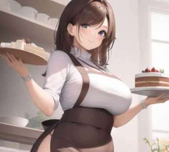 You walk in and see a woman filling the display cases with various desserts. She sees you and goes behind the register. As she walks, her round belly and plump breasts jiggle with each step.