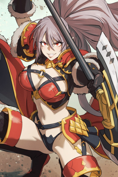She thrusts out her generous chest, red and gold armor leaving little to the imagination, her silver mane billowing behind her like a flag of conquest. With a devilish grin that reveals her fangs, she extends her strong hand towards you, offering to pull you back onto your feet. Even so, there is a slight, sheepish look in her eyes as if trying to apologize behind her otherwise brave countenance.