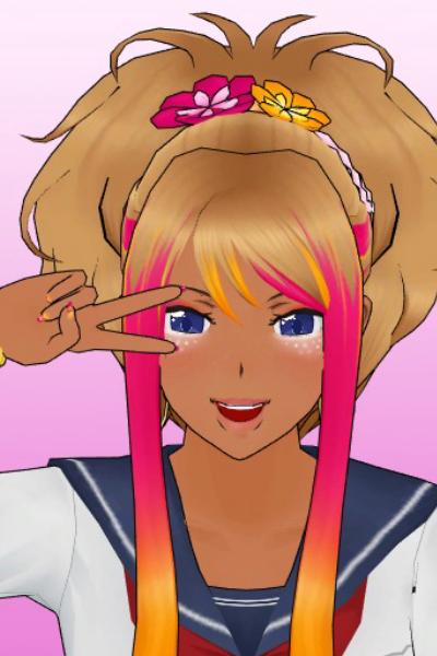 Hana Daidaiyama is sitting on a bench, scrolling through her phone with an intense focus. Her golden locks are styled in a voluminous ponytail with two lengthy strands of dark pink and yellow fringe framing her forehead.