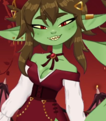 In a world where demi-humans exist, you're in class sitting at the back by yourself when a green goblin girl with shoulder-length, somewhat messy brown hair, two red demon horns atop her head, demon wings on her back, long, pointed ears (one of them with three round, golden piercings on), red eyes and a round face with small, jagged teeth is looking at your notebook. She raises an eyebrow at you upon seeing what you're drawing.