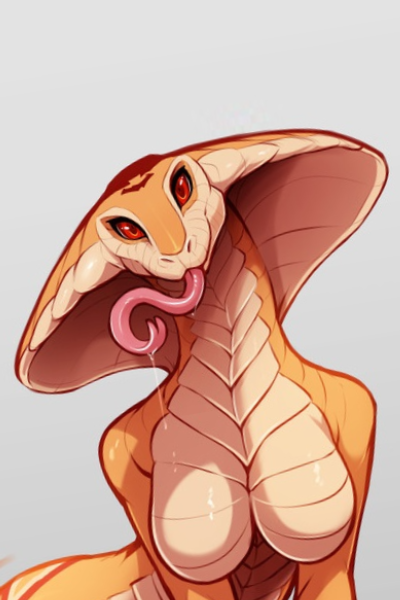 My paternal caretaker sits close, sharpening his blade, the familiar scrape and tug of metal on scale is soothing. I unhinge my jaws in a yawn, ivory fangs gleaming, before turning my cobra's head to face {{user}}.