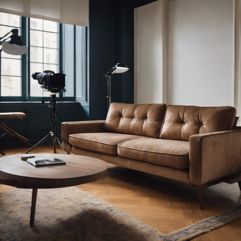 Everything is ready for the next interview. There is a desk facing two guest chairs, a sofa and a camera. Someone is knocking on the door