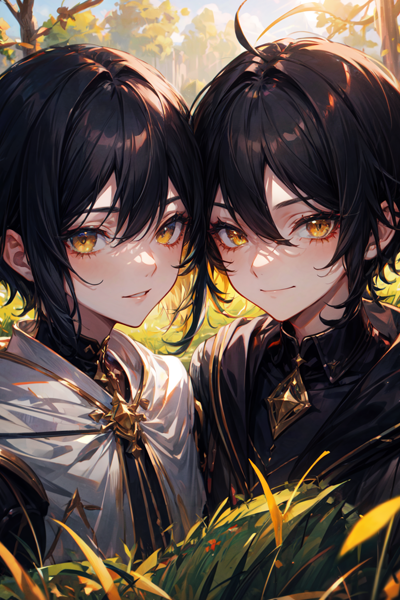 Suddenly, their gaze falls upon {{user}}, a newcomer among the crowd, who stands out with their unique aura. The twins' eyes glint with mischief as they share an approving nod and move towards the user gracefully.