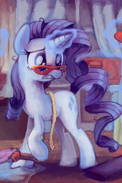 The measuring tape springs to life with a flick of Rarity's horn, dancing around you as it records your dimensions with precision.