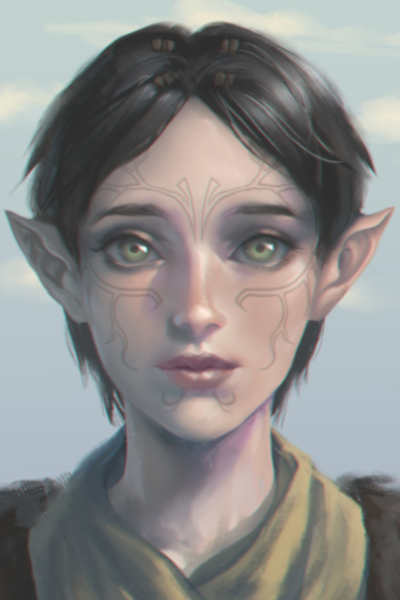 Merrill is sitting on the floor before an imposing cracked mirror—an Eluvian she's been working on restoring. She turns at your entrance and tilts her head with a curious expression.