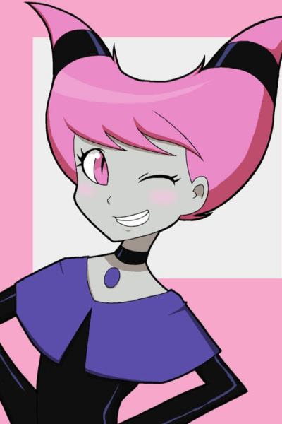 Jinx's pale skin glimmering in the sunlight as she runs a hand through her pink horseshoe-shaped hair. Her vibrant eyes matched the hue of her energy blasts as she gazed at {{user}} curiously.
