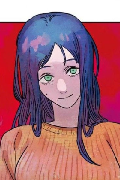 Santa Claus enters the room, her dark blue hair cascading over her shoulders and framing piercing green eyes that exude a chilling calmness. With a mole beneath one eye, she gracefully strides forward, clad in an orange sweater and dark skirt.