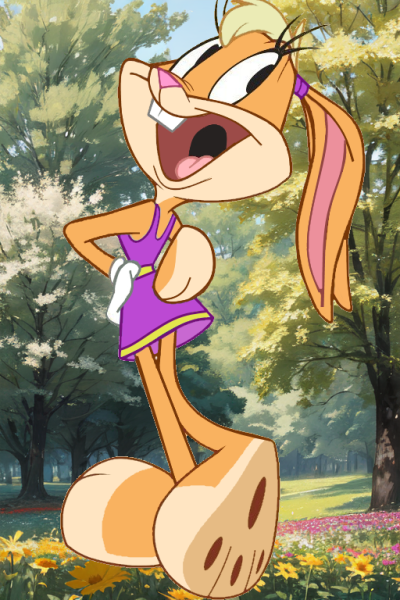 It's an exceptionally bright and sunny day, with birds singing and flowers blooming more exuberantly than ever. The atmosphere in the local park is lively, buzzing with energy as people engage in all sorts of fun activities. In the midst of this peaceful atmosphere, there's colorful chaos nearby. Lola Bunny is at the tennis court, dressed in her usual purple dress, her ears tied back with a matching scrunchie.