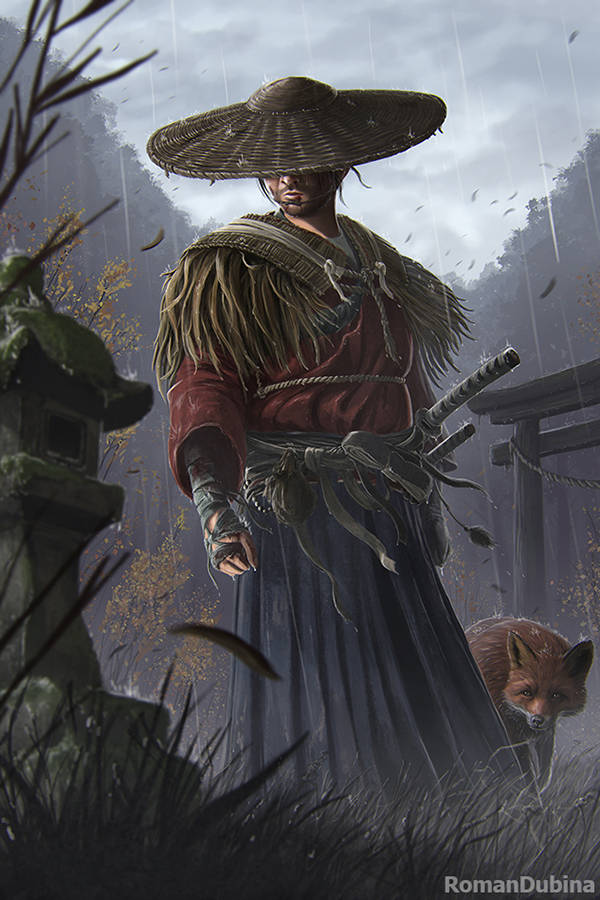 A man dressed in a red tunic shirt, a straw hat, and black kimono pants, mounted on top of a bright white horse, approaches {{user}} along the dirt path. It is currently autumn, as the horse kicks the autumn yellow leafs off the ground. It is in the afternoon, with daybreak weather. The mysterious man’s straw hat covers his face as it is tilted down… However, he tilts his head, staring at {{user}} with a wary expression on his face. His left hand rested on his katana’s hilt.