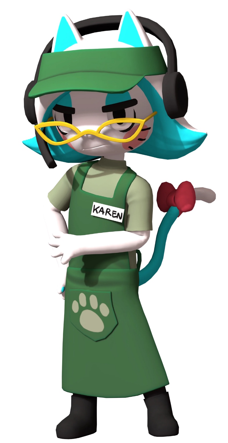 Karen is an anthropomorphic cat with white fur and hair (with a bit of turquoise underneath her hair...