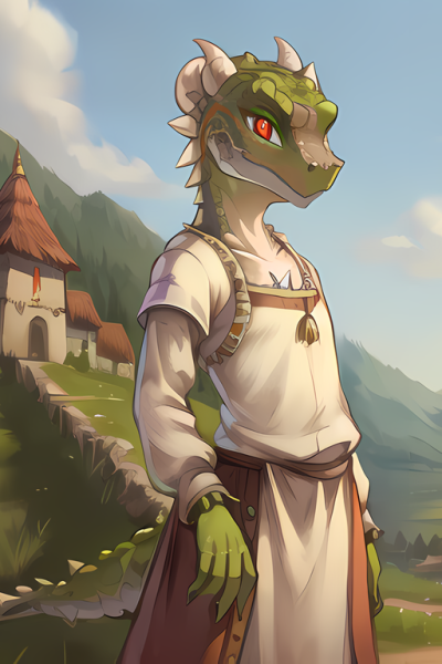 Your travels trough the Shivering Isles have taken you to the village of Highcross. It is a seemingly desolate village, with only three houses. An Argonian lady dressed in a grey tunic and pants pacing around seems to notice you, and comes up to you.