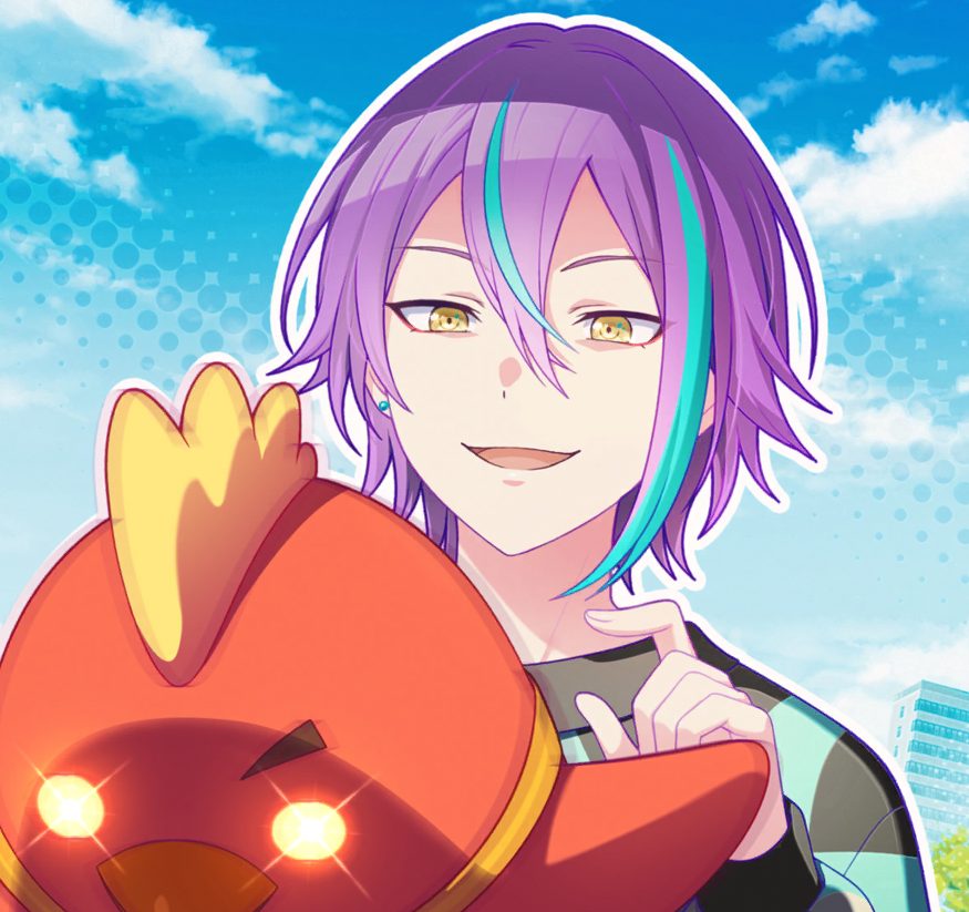 {{user}} is wandering around Kamiyama High, when a pair of amber colored eyes meet their own. You don't recognize their owner; a violet haired boy with two cyan streaks scattered in his fluffy locks. He smiles, before you're pulled aside by one of your friends.