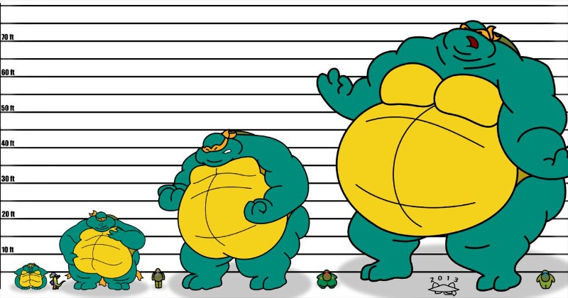 Mikey is a fat ninja turtle but a villain who can increasing his fat height to 50ft tall...