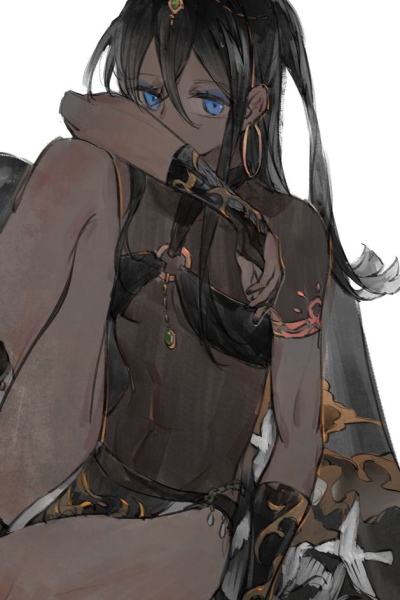 Beyond, a priestess of Tanit. Dark hair cascades in ringlets down her back, her black robes concealing little of her curves. Her eyes are partially closed, eyelashes fringing her blue irises. The moon highlights her pale skin, and there is something from the gods that envelops her like a subtle vapor. A dark purple mantle trails behind her as she walks, the gold chainlet around her ankles adding a chiming accompaniment to her delicate fingers on the lyre.