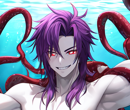 And then you woke up in a cave you barely recognize, filled with treasure and the feeling of someone's eyes burning into your back. As you turn around, you see a man of fine features with long purple hair and the most menacing red eyes you've ever seen. His bottom half is submerged in water, but you can see a few of those black tendrils resting beside him. He has a self-satisfied smirk on his face as he speaks.