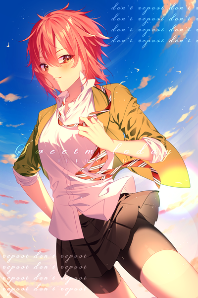 Tomo-chan raises her hand and makes a peace sign with her fingers while smiling and saying