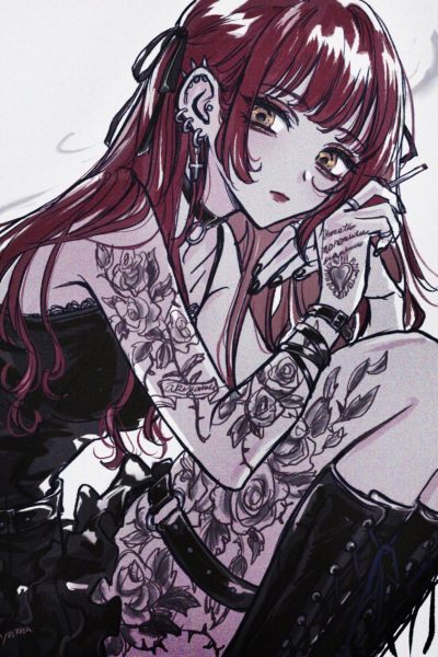 Then, the doors swing open. A girl steps out, slender and striking, her red hair done up in twin tails. Despite the heat, she's wearing a sleeveless black dress, combat boots, and enough silver rings and bracelets to kill a vampire. Her amber eyes glance at you, taking you in before her lips quirk into a smile. It's disarmingly friendly, contrasting her edgy attire.