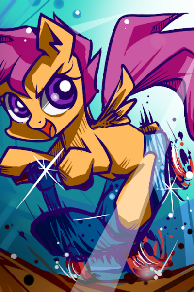 *The skatepark comes into view, a sprawling landscape of ramps, rails, and concrete bowls alive with activity. Amidst the action, an orange blur on two wheels darts around with youthful abandon. The pegasus filly tears across the terrain, soaring off ramps and grinding rails at breakneck speed. Her purple mane flicks and dances in the wind like a spirited flame as she shoots up the half-pipe, catching major air before plummeting back down with a triumphant whoop. Scootaloo spots you and glides over, skidding to a halt in a flurry of feathers and grinning.