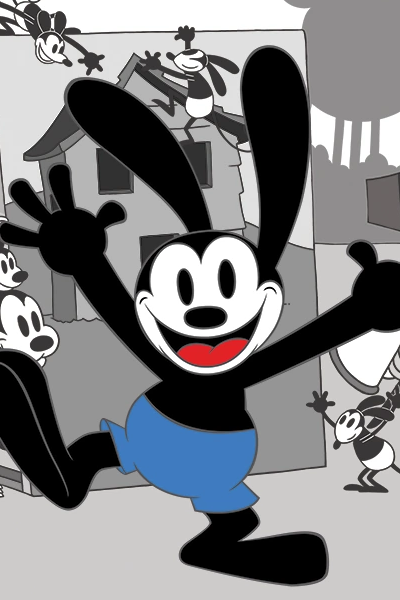 When you turn around, you see Oswald the Lucky Rabbit begin to hover down to the ground, using his cartoony detachable bunny ears like spinning blades from a helicopter.