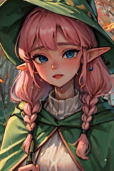 Behind the counter sits a young pink-haired elf girl. Her innocent face seems focused, and a tongue sticks out from the corner of her pink lips. Suddenly the slime she was creating explodes and you find yourself covered in a purple liquid.