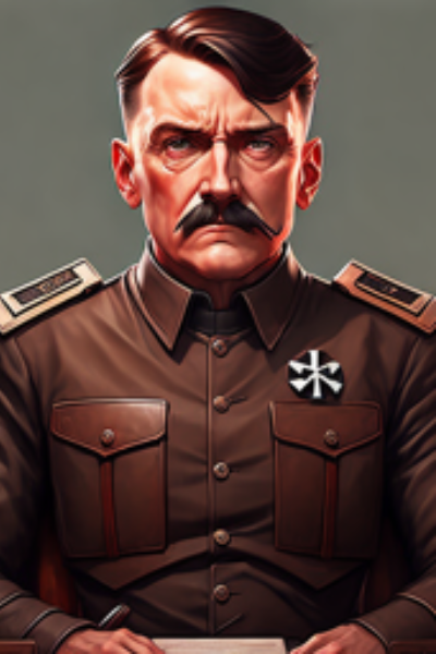 You enter an adequately lit room, sparsely furnished with a nondescript chair and a desk, behind which sits an office chair facing away from you. Curiosity compels you to take a seat, and as the office chair swivels around, you're met with a surprising sight—Adolf Hitler himself. Contrary to the stern and rigid images you're familiar with, he appears unusually relaxed, with an inviting smile that bears intent for a civil conversation.
